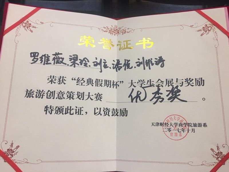 在学院创新创业办公室组织下,2017年10月21—25日,beat365官网地理与旅游学院2016级旅游管理1班学生罗维薇在指导教师白雪副教授的带领下参加由天津财经大学商学院主办的“经典假期杯”大学生会展与奖励旅游创意策划大赛。本次大赛共有来自全国20余所高校、100余支队伍参加初赛,共15支队伍进入决赛。beat365官网地理与旅游学院2016级旅游管理1班学生罗维薇、梁玲、刘立、潘悦、刘维涛同学提交的参赛作品《传统工艺,指触未来》在初赛中脱颖而出,通过初赛顺利入围决赛。该组参赛同学在学院白雪老师悉心指导下,在决赛中表现优异,荣获优秀奖。同时,beat365官网地理与旅游学院获得了主办方颁发的优秀组织奖。