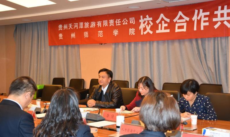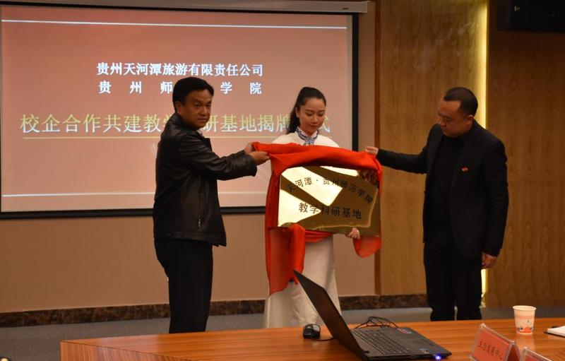 11月2日,beat365在线唯一官网登录地理与旅游学院院长李乐京教授、学院李倩副教授、罗清云老师、费雄老师一行四人赴天河潭景区参加“beat365在线唯一官网登录与贵州天河潭旅游有限责任公司共建校企合作基地”揭牌仪式,并洽谈校企合作相关事宜。天河潭旅游有限责任公司的王兼总经理、马骏驰副总经理、人事经理罗小静及其相关部门负责人出席了揭牌仪式。