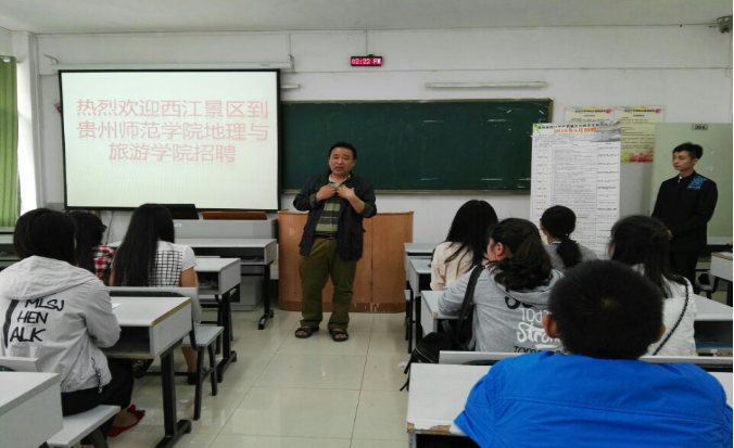接下来,景区工作人员向参会同学播放了西江千户苗寨介绍短片,唯美的西江人文、自然景观深深吸引了同学们的注意力;接着景区工作人员介绍了作为国有大型企业的景区职位提供情况;最后对具有初步加盟意愿的同学进行了简洁的面试并现场辅导就职表格填写。