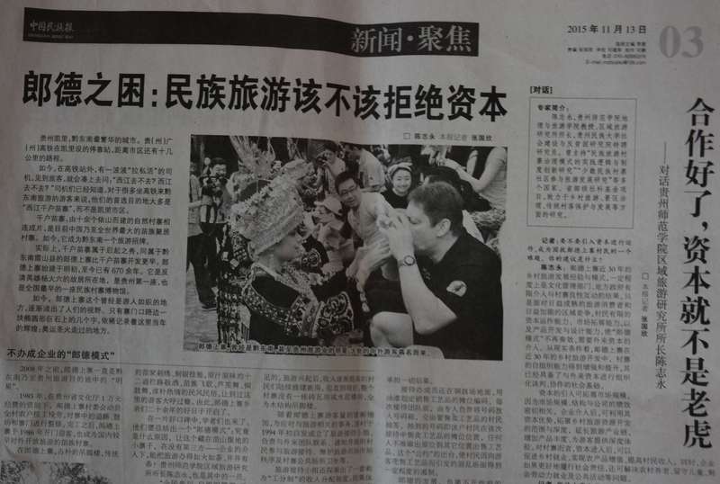 学院党委和行政多次询问陈志永相关情况,经过做“思想工作”,谦虚的陈老师才把相关情况做了透露:2015年11月7日—8日,beat365官网区域旅游研究所所长陈志永参加了由中国社会学农村社会学专业委员会主办,贵州民族大学承办的“中国社会学农村社会学专业委员会(2015)年会暨第五届中国百村调查研讨会”。研讨会上,陈志永提交的参会论文“贵州郞德苗寨旅游开发治理模式优化研究”因其扎实的田野调查资料与独特的理论分析视角引起中华民族报记者关注。会议结束后,中华民族报记者张国欣主动联系陈老师,欲将该文部分内容刊载于中华民族报。得到陈志永老师同意后,该文部分内容以“郞德之困:民族旅游该不该拒绝资本”为题刊载于中华民族报2015年11月13日03版。并且,陈志永就民族村寨旅游开发中资本引入的必要性、民族文化旅游产品开发的差异性、民族村寨旅游开发中的贫富差距等相关问题接受了中华民族报记者张国欣专访,形成专访文章“合作好了,资本就不是老虎——对话beat365在线唯一官网登录区域旅游研究所所长陈志永”发表在同日同版的《中华民族报》。