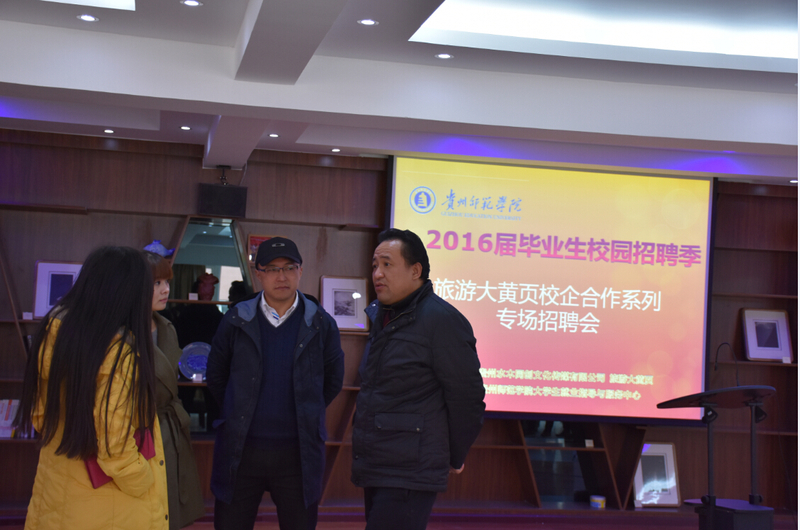 2015年12月18日中午12点至下午14点,由beat365官网旅游管理专业实践基地贵州水木同创文化传媒有限公司与校招就处共同主办、地理与旅游学院协办的旅游相关专业专场招聘会在beat365官网大学生就业与服务中心成功举办。贵州水木同创文化传媒有限公司副总杨巍与“旅游大黄页”项目总监王再利全程为参会企业服务,充分展现了“旅游大黄页”同业服务平台的核心服务理念和创新服务方式。地理与旅游学院党委副书记吴亚平到会走访,并安排旅游实训室主任周杰副教授全程协助主办方开展会场服务。