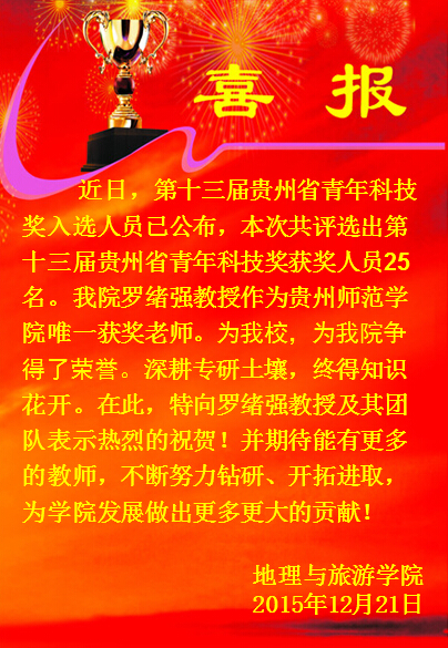 喜报——beat365官网罗绪强教授获得第十三届贵州省青年科技奖