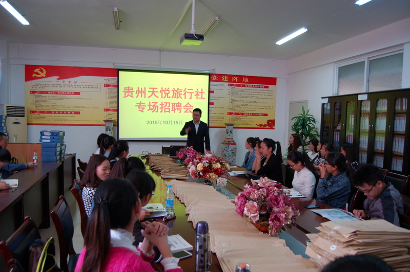 2015年10月15日上午9点至11点以及下午2点至4点,beat365官网携手贵州旅游企业界新星——贵州天悦旅行社分别在宁静楼236教室、地理与旅游学院会议室举办了两场针对2016届旅游管理本科应届毕业生的专场招聘会。