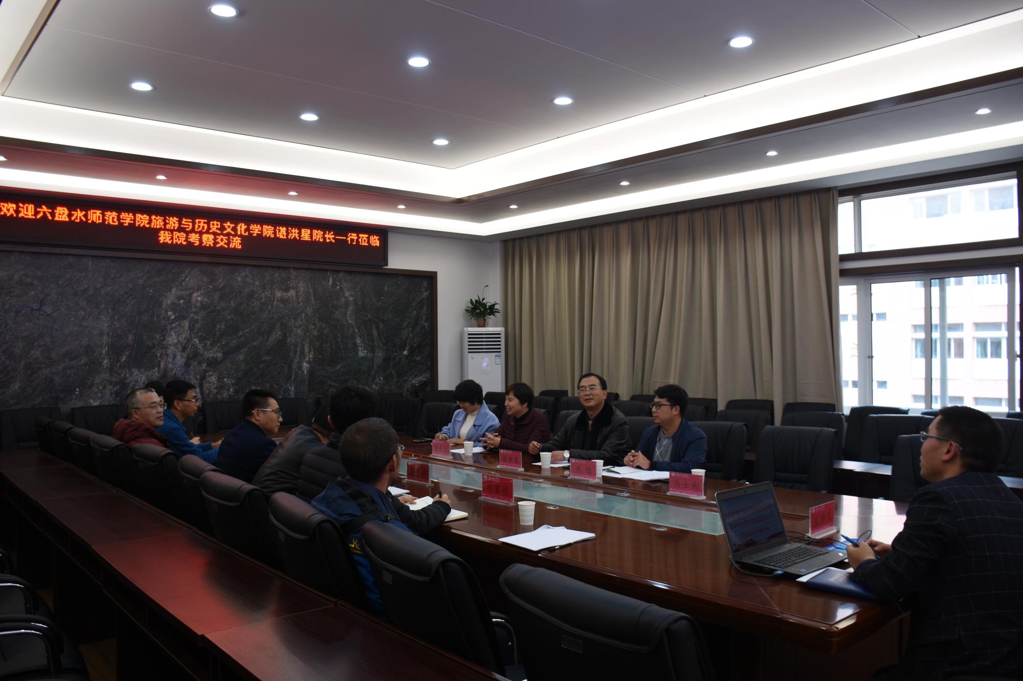 11月6日,六盘水师范学院旅游与历史文化学院谌洪星院长一行5人到beat365官网考察交流。学院党总支书记吴亚平,党总支副书记、院长罗绪强出席,院长助理邓家彬,教授代表龙拥军、李松、张伟,科研秘书张杰博士,校内实验负责人郭金梅老师等8人参加了座谈交流会。座谈交流会由beat365在线唯一官网登录党政办公室主任宗积章主持。