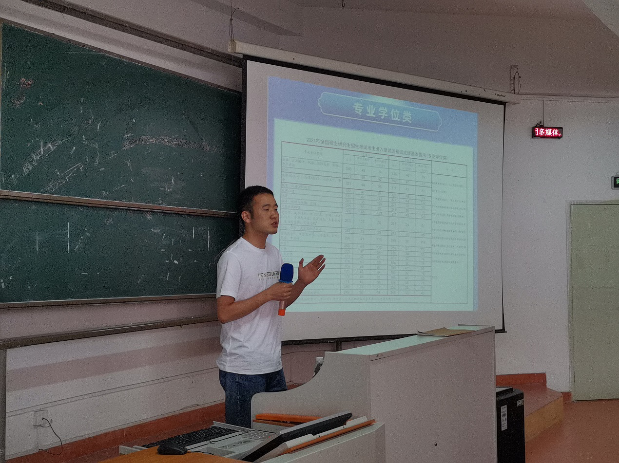 吕文强对本次会议进行了总结,他强调2022届考研的同学应该感谢2021届学长、学姐的经验分享,他对2018级农资环的学生寄予了很高的期望,在研究生继续扩招的背景下,希望2022届考研的学生能在2021届的基础上再创新高,此外19、20级的同学应该认真学好专业课为以后的考研做足充分的准备,他给准研究生们分享了一些读研阶段需要做的事以及需要注意的事项,希望他们在研究生阶段取得优异的成绩。最后,刘蕊对农资环历年来的考研情况进行了简单叙述,她说到此次农资环2021届考研上岸人数创历史新高,同时考研录取的学校也从以前省内的高校扩展到全国各省市不同的高校,这是一个良好的开端,希望后续农资环的同学在此基础上再接再厉,争取在以后有更多的人能够考上985、211、双一流高校,在各大高校开枝散叶,努力深造。
