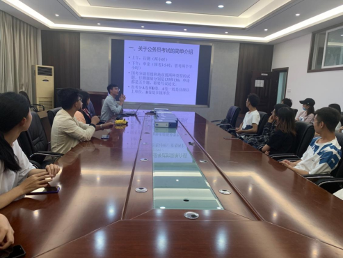 紧接着由四位通过今年公务员面试的应届毕业生肖天一、赵超超、范茜、杨胜兰结合自身经历依次从公考形式、公考流程、考试内容、岗位选择、备考资料选择、行测和申论复习方法、面试注意事项等方面进行分享交流。会上学长学姐们知无不言言无不尽,为前来学习经验的学弟学妹们提供了一场详尽的交流分享风暴,每一位分享了自己的经验和心得后都迎来了热烈的掌声。经验交流结束后,四位学长学姐耐心解答学弟学妹提出的问题,给他们带来了很大的启发,对他们的公务员备考起到积极的帮助作用。