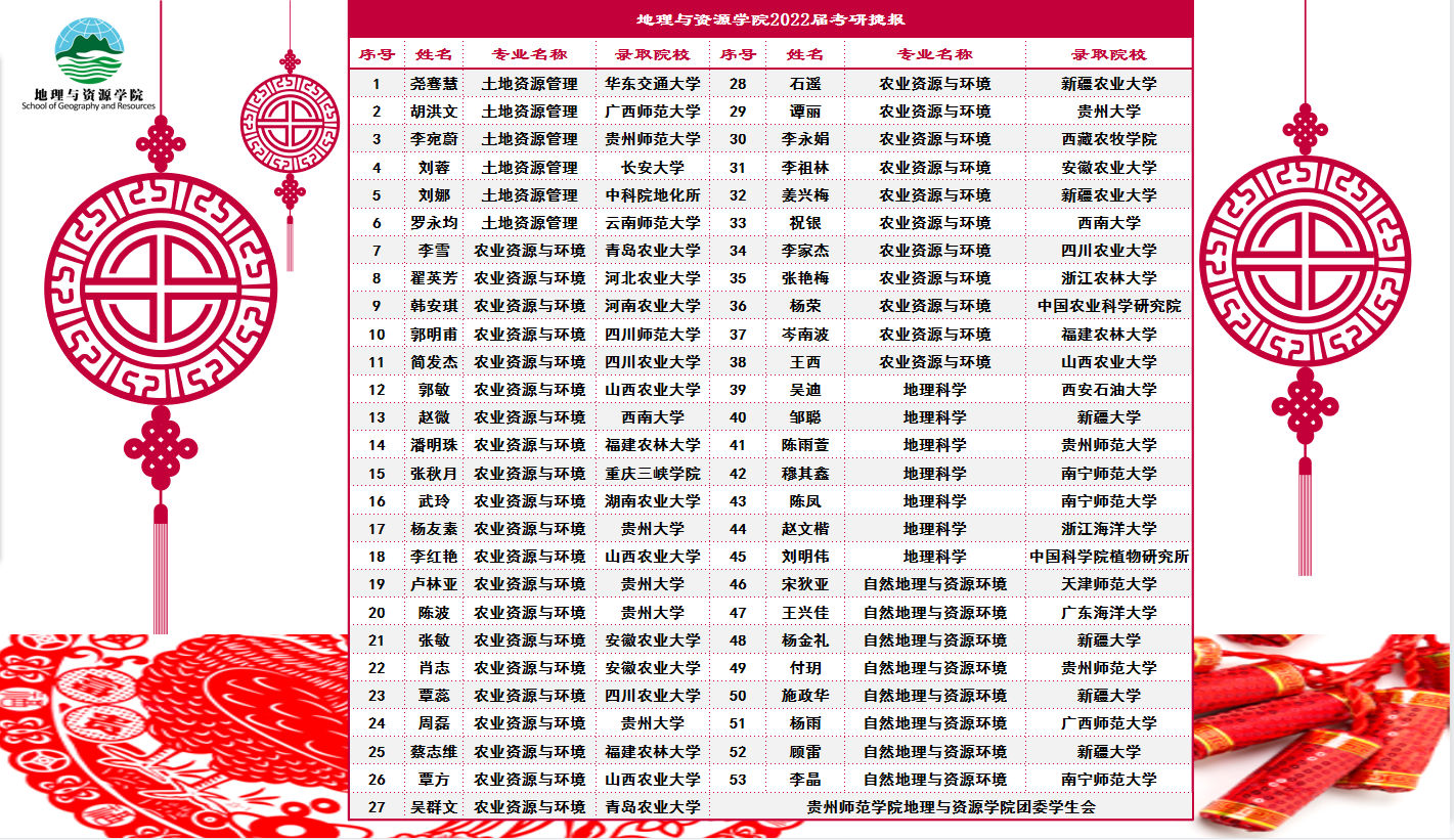 “幸福是奋斗出来的”,习近平总书记的这句话平实质朴,饱含情怀,催人奋进,激荡光荣与梦想,一直点燃着地资师生在新时代奋发向前的激情。还记得去年,学院召开2021届考研总结表彰暨2022届考研动员大会,在火热的氛围中地资人宣誓的场景历历在目,一年时间转瞬即逝。在选择了奋斗之后,全体师生的艰辛换来了新的收获,换来了更大的成绩,获得了地资人又一次的幸福与骄傲!尤其值得一提的是,考研的“明星”专业——农业与资源环境,在69人中考研拟录取32人,考研升学率高达46.38%;一个宿舍考上4人的“考研明星宿舍”,是同学间长久的鼓励和陪伴;初出茅庐的考研“新秀专业”也出来了,自然地理与资源环境专业今年崭露头角,考上8人,为做好明年的考研工作开了好头。
