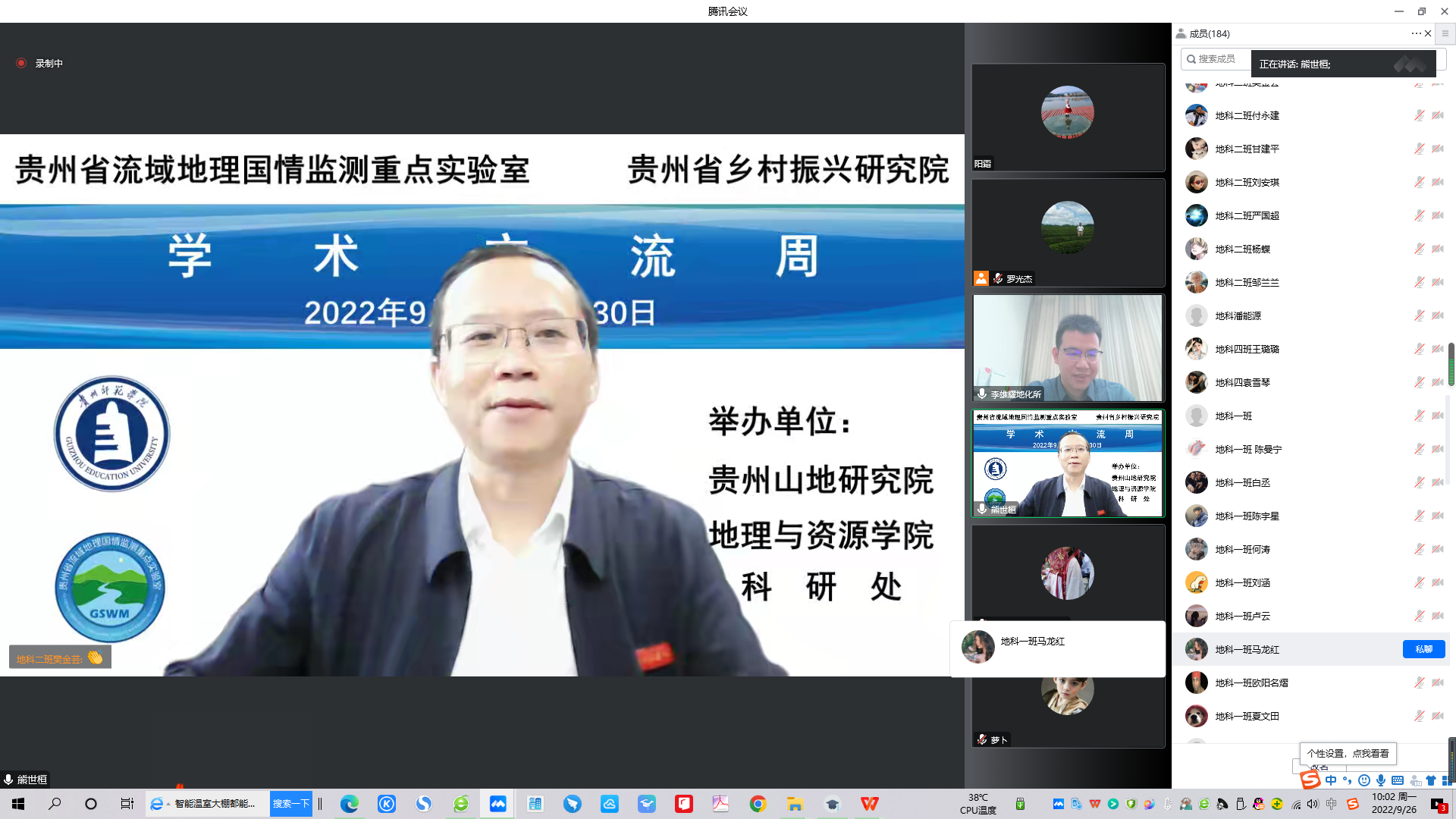 为加强学术交流,营造良好学术氛围,拓展学术领域,推动学科平台高质量发展,2022年9月26日--30日,beat365官网贵州山地研究院、beat365在线唯一官网登录、科研处联合举办地理与资源类学科2022年下半年学术交流周。受当前疫情影响,交流周活动在腾讯会议进行,学校党委副书记熊世桓主持了专家学者学术报告,地理与资源类相关专业教师、研究生、本科生参加了学术交流周全部特邀报告。