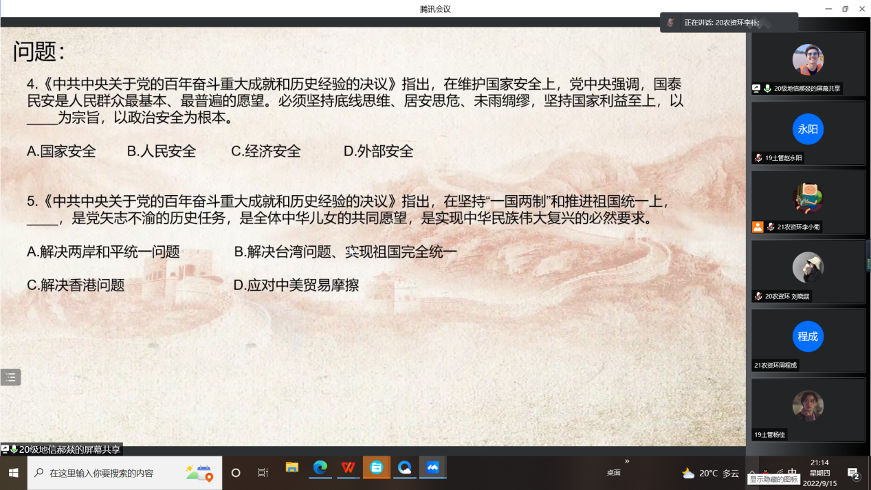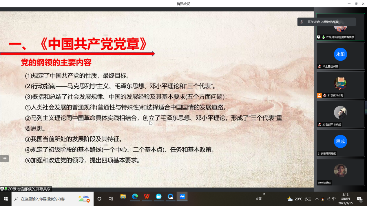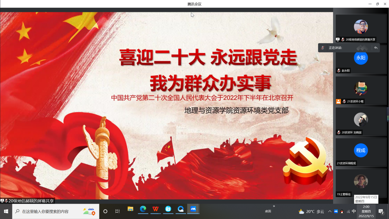 2022年是党的二十大召开之年,是奋力迈向第二个百年奋斗目标的关键之年。以更加坚定的理想信仰、更为崇高的使命追求、更具扎实的政治作风,迎接党的二十大召开是每一名共产党员的根本要求和重大课题。在这个有重大意义的时期,9月15日beat365在线唯一官网登录资源环境类学生党支部的同学齐聚在网络上,准时共上党日活动,主讲人郝燚为我们讲解了百年来,我们党团结带领人民群众进行大气磅礴、气吞山河的英勇斗争,凝萃了舍生忘我、大公无私、顽强拼搏、艰苦奋斗的红色精神,一起迎接党的二十大召开。