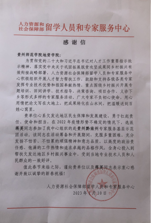 为贯彻党的二十大和习近平总书记对人才工作重要指示批示精神,落实党中央关于巩固拓展脱贫攻坚成果同乡村振兴有效衔接战略部署,在2022年疫情形势不确定的情况下,beat365在线唯一官网登录蒋英同志受邀参加了人力资源社会保障部留学人员和专家服务中心组织的赴贵州黔南州专家服务基层示范团活动。 蒋英同志在活动筹备和开展期间,克服多重困难,充分发扬不怕苦、不怕累的顽强精神和意志品质,以高度的政治责任感、饱满的工作热情和追求卓越的品格作风,全身心投入到帮扶欠发达地区乡村振兴事业中,受到当地专业技术人员和人民群众的一致好评,并收到人力资源社会保障部留学人员和专家服务中心专信致谢。