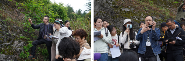 本次野外考察以乌当区水东路小谷农附近的断层遗迹为起点,径东风镇瀑布冷库、乌当区省级地质公园、情人谷等8个观察点。野外实地考察中,李松涛、许冲两位地质学专业博士从乌当区地质历史、地层年代、岩石类型和矿物成分、岩层产状、岩相古地理、古生物化石类群、典型构造和野外地质实践技能等方面进行了系统介绍,并且现场指导参加活动的教师使用地质罗盘进行岩层产状测量,鉴别典型岩石矿物类型,观察和采集腕足类、三叶虫、古杯、海百合等古生物化石。