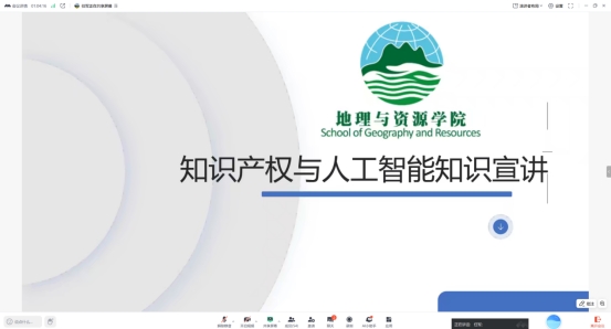 4月23日—26日,地理与资源学院采用线上线下相结合的方式,举办了以“知识产权与人工智能”为主题的宣讲活动,讲座面向对象为学院全体师生。针对学院教职工的讲座以线上会议形式开展,由任军老师担任主讲人。任军老师从知识产权的定义、组成要素以及如何保护知识产权等方面进行了深入讲解。针对学生的宣讲在beat365在线唯一官网登录山骨讲堂举行,由周光红老师担任主讲人。周光红老师对人工智能与知识产权的定义分别进行了界定,接着分析了二者之间的关系,认为把握好二者关系能够有效促进知识产权产出与保护,对高校师生服务科技生产也具有一定的促进作用。