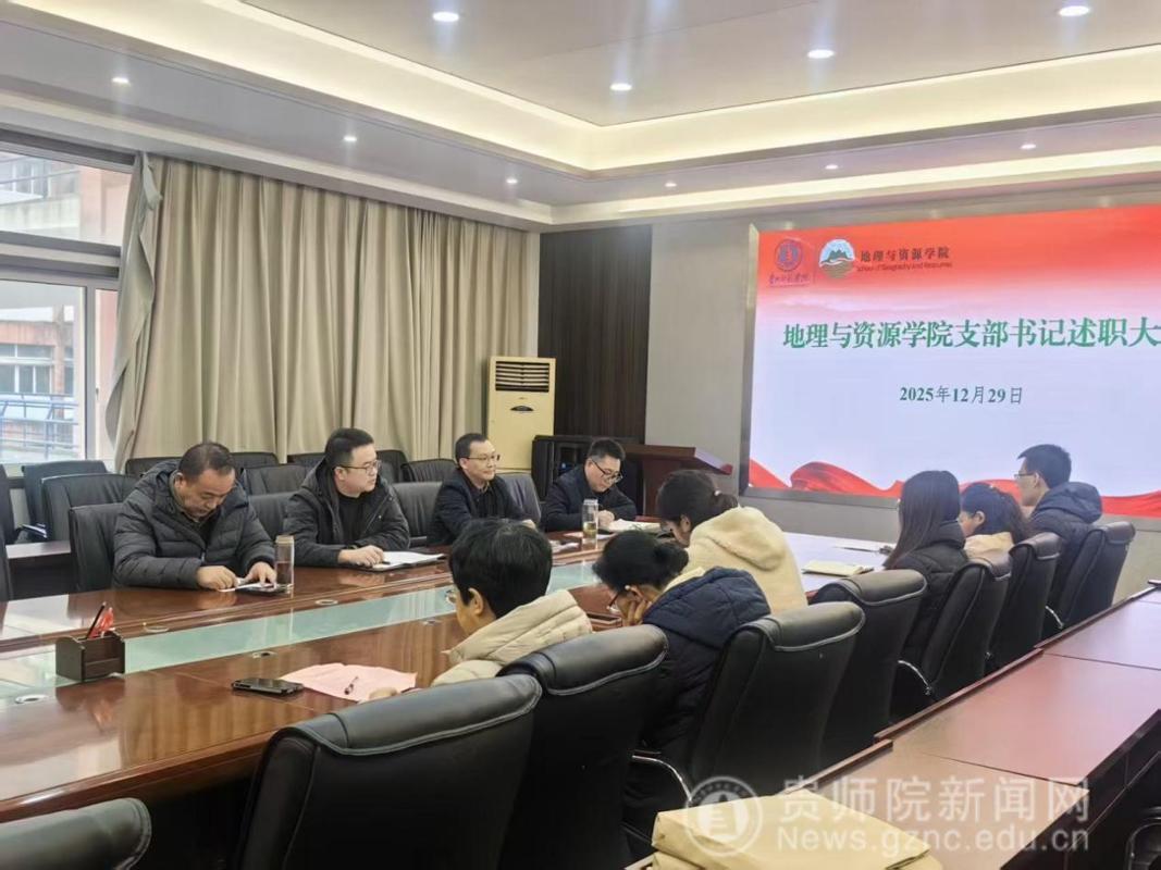 会上,教师党支部书记樊云龙从推进党建与业务深度融合角度出发,以入选全国高校“双带头人”教师党支部书记“强国行”专项行动团队为契机,积极探索“野外+党建”创新学习模式。地理科学类学生党支部书记刘丹丹和资源环境类学生党支部书记徐秀月从关注学生发展角度出发,紧密结合专业特色开展党建。组织开展系列专题学习与研讨,注重通过读书分享会等形式,激发支部活力。述职中也深刻剖析了各支部工作中存在的问题和不足,并提出了针对性的改进措施。杜彪书记在总结评议中,充分肯定了各支部工作,针对性指出改进方向,并面向2026年的党建工作,重点提出三项明确要求:第一,各支部要将抓规范化、标准化建设作为履职的第一要务,确保在党建成效考核中做好“规范动作”,为学院争优评先奠定坚实基础。第二,要持续在品牌创建和特色凝练上发力,充分发挥党支部战斗堡垒作用,汇聚智慧做好“自选动作”,打造具有学科辨识度的党建品牌。第三,要根据学校党建“双创”工作部署,探索建设功能型党支部,优化支部框架与人员结构,强化目标导向,团结一切力量,不断开创高质量党建引领学院高质量发展的新局面。