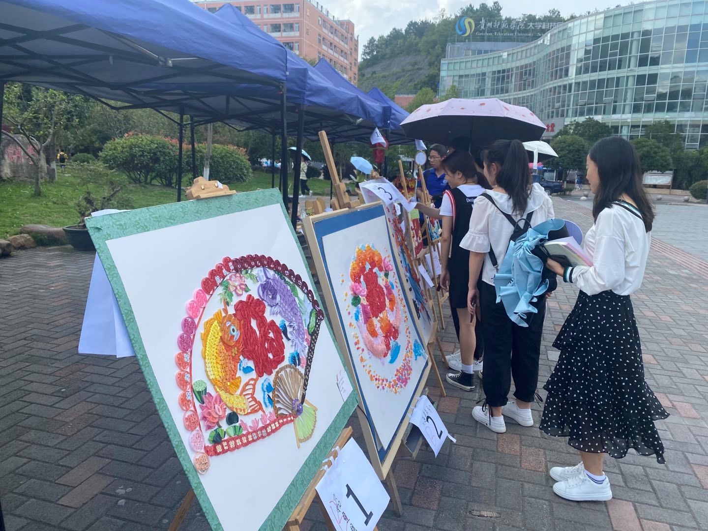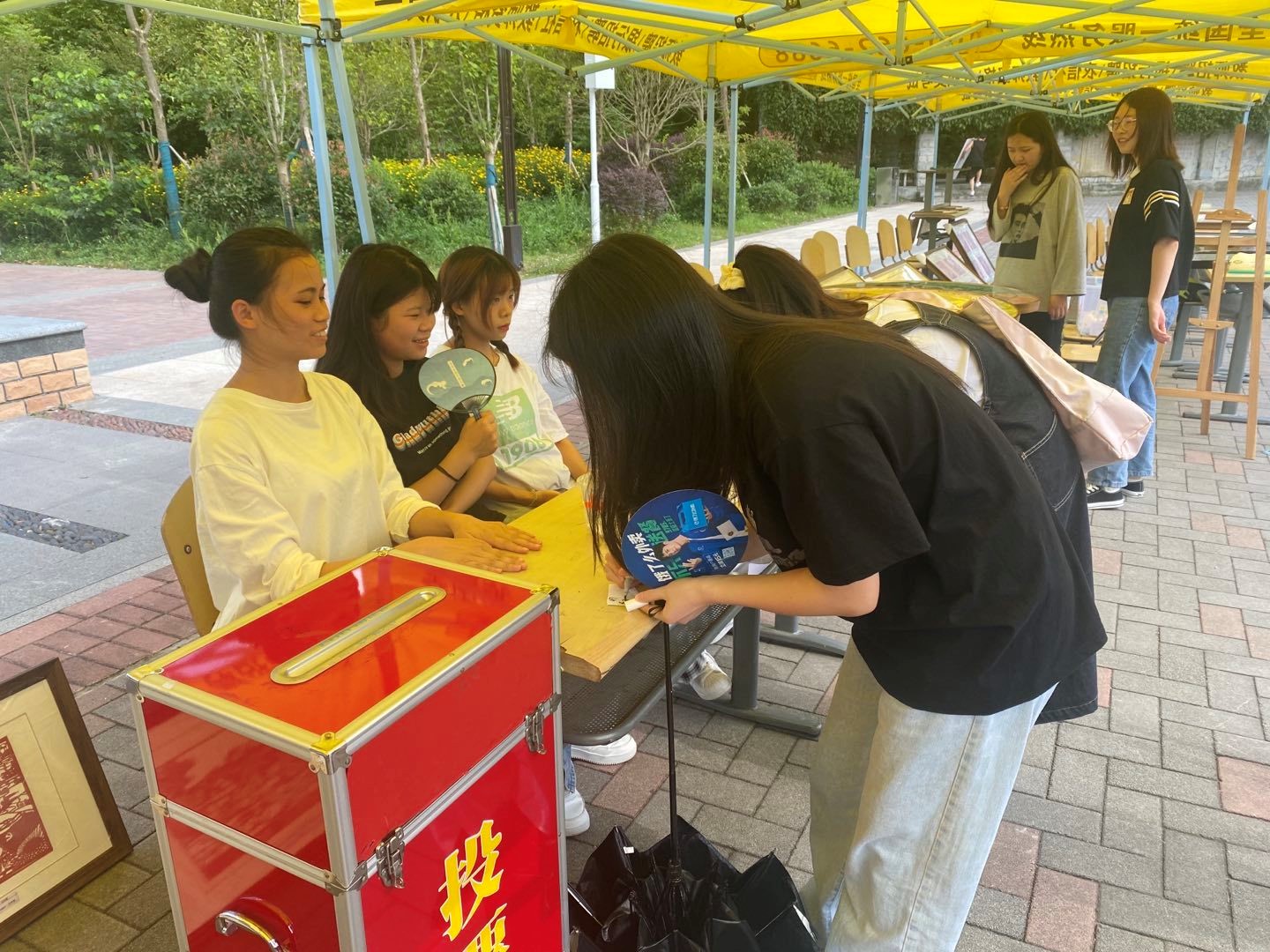 活动现场,同学们创作的有关党史的作品整齐有序的摆放在鉴湖旁。剪纸、手工、绘画的国旗、党徽、党旗和天安门等都抒发了同学们对党的热爱之情。炎炎夏日,同学们在志愿者的讲解和引导下津津有味的欣赏着,并为喜欢的作品投出宝贵的一票。在一天的展览下,获奖的作品已然决出,名单将会后续整理后公布。